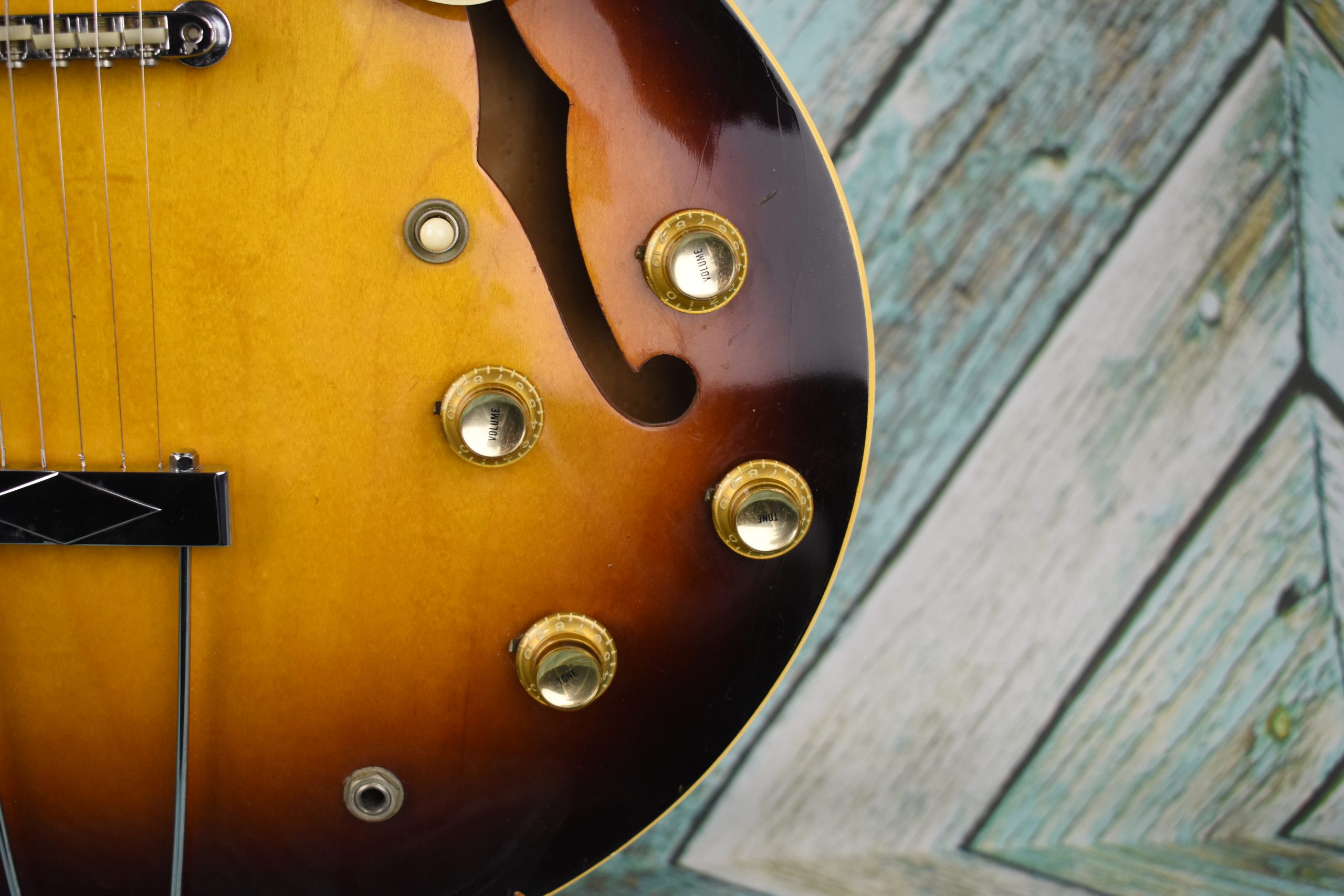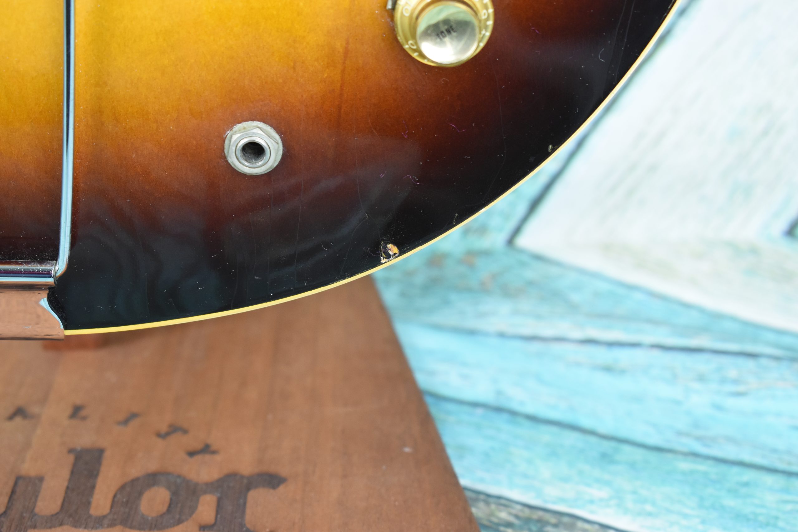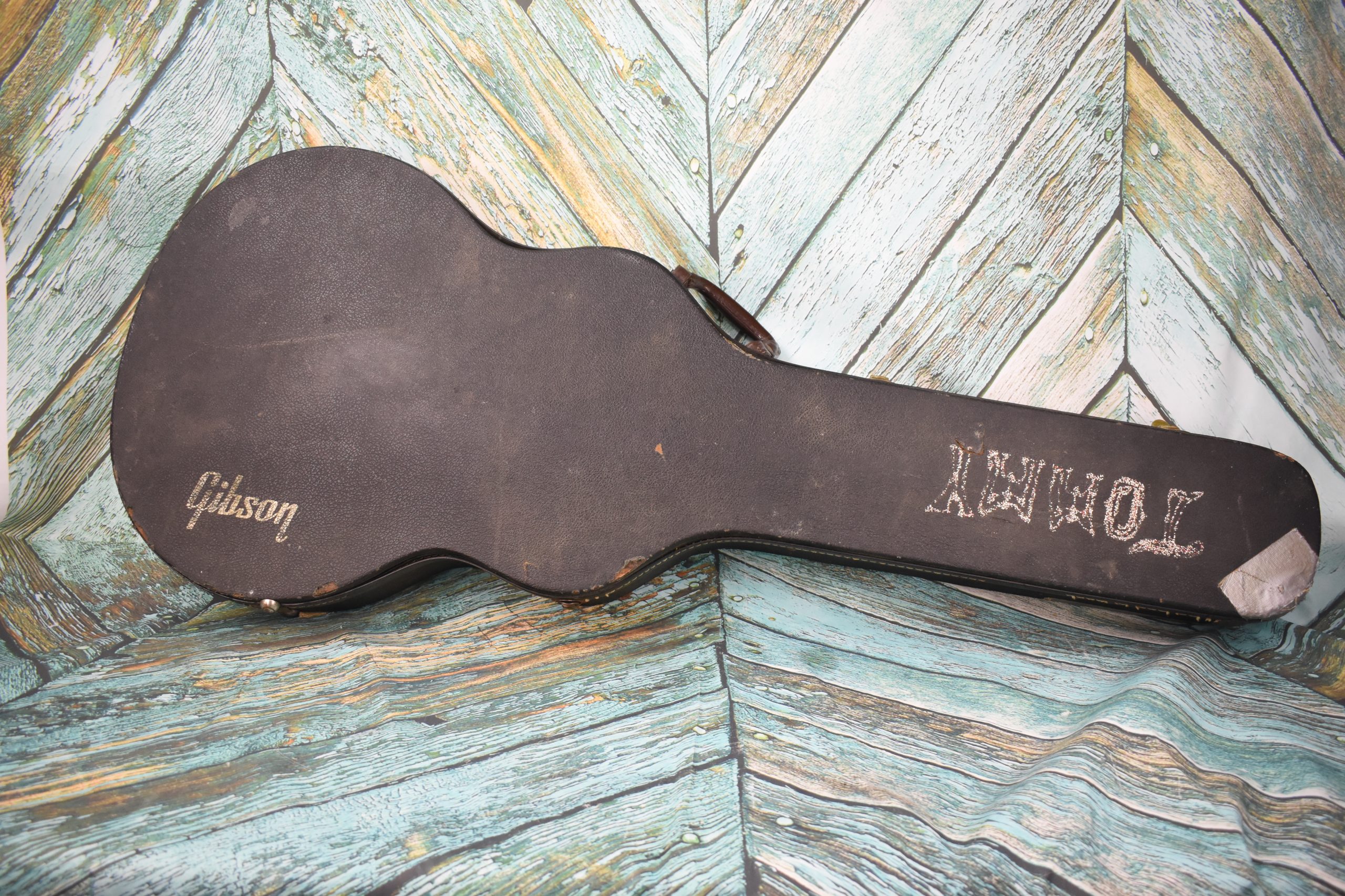 We’re listing this guitar conservatively in good condition; others might list it as very good. As expected from a vintage guitar, some slight dings and marks are evident as photographed. There’s also minor finish checking along the body, but absolutely no cracks or fissures. It features all the original electronics, with the solder points being untouched. The origin of this piece of art is lost to history except for the name on the case: “Tommy.”