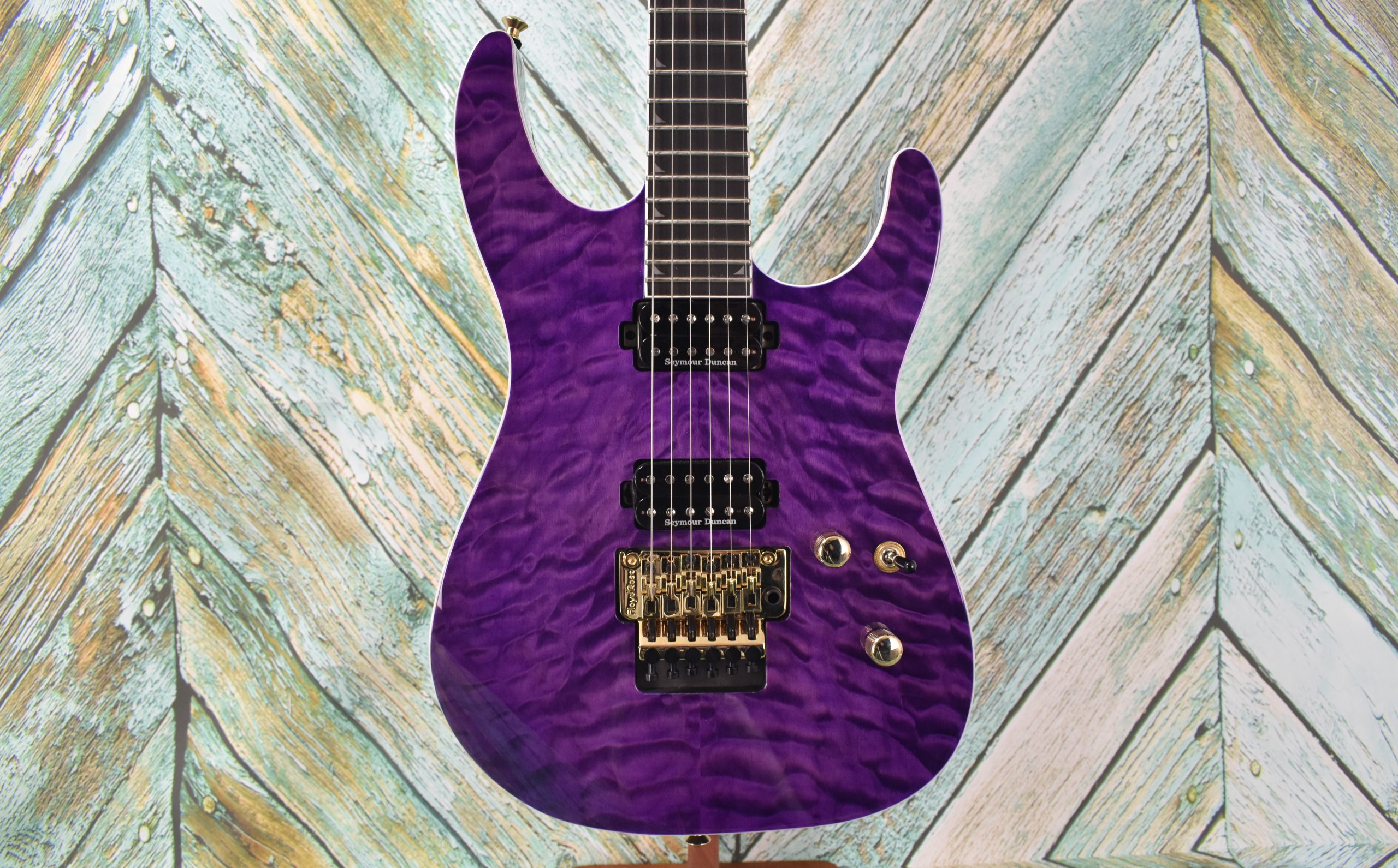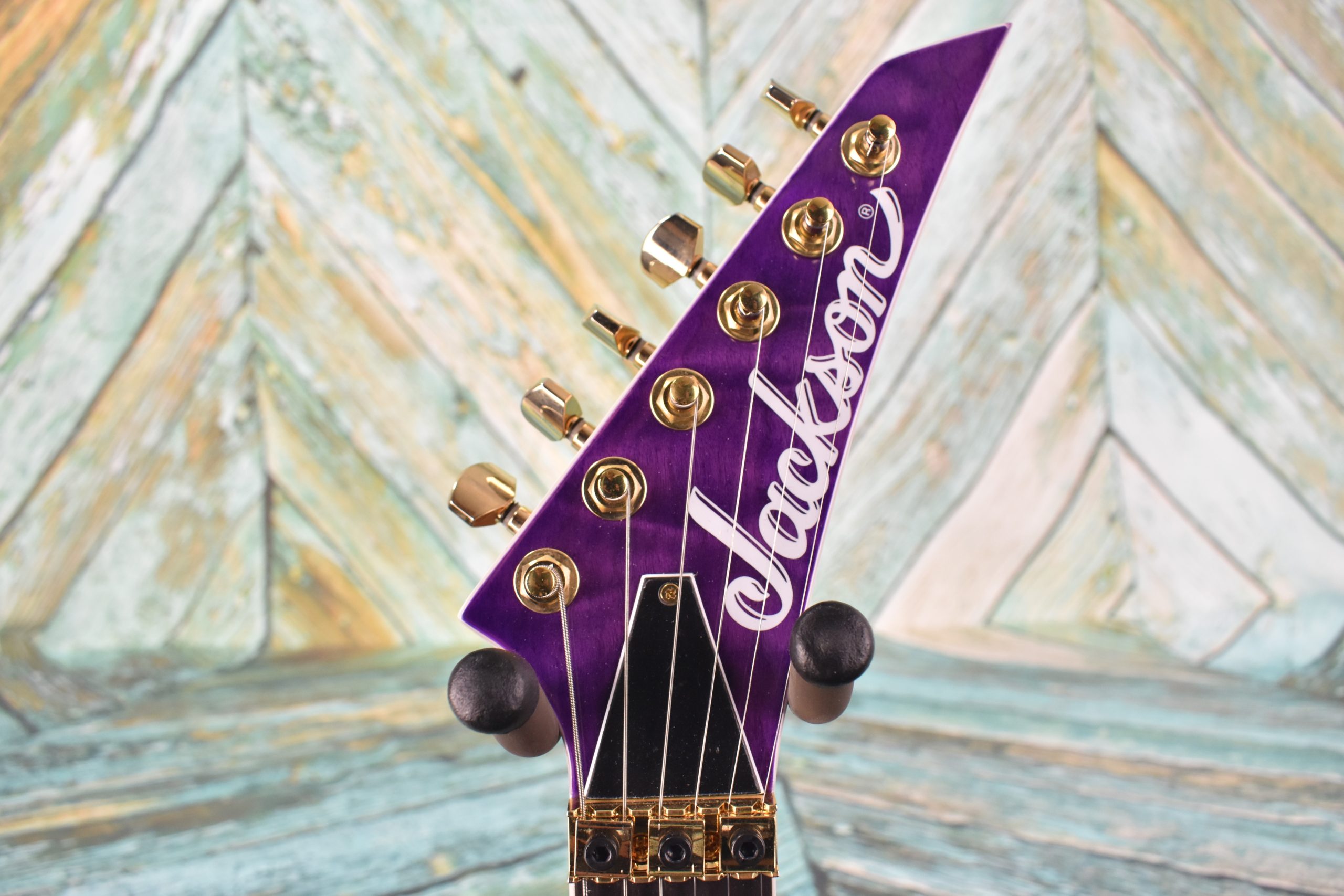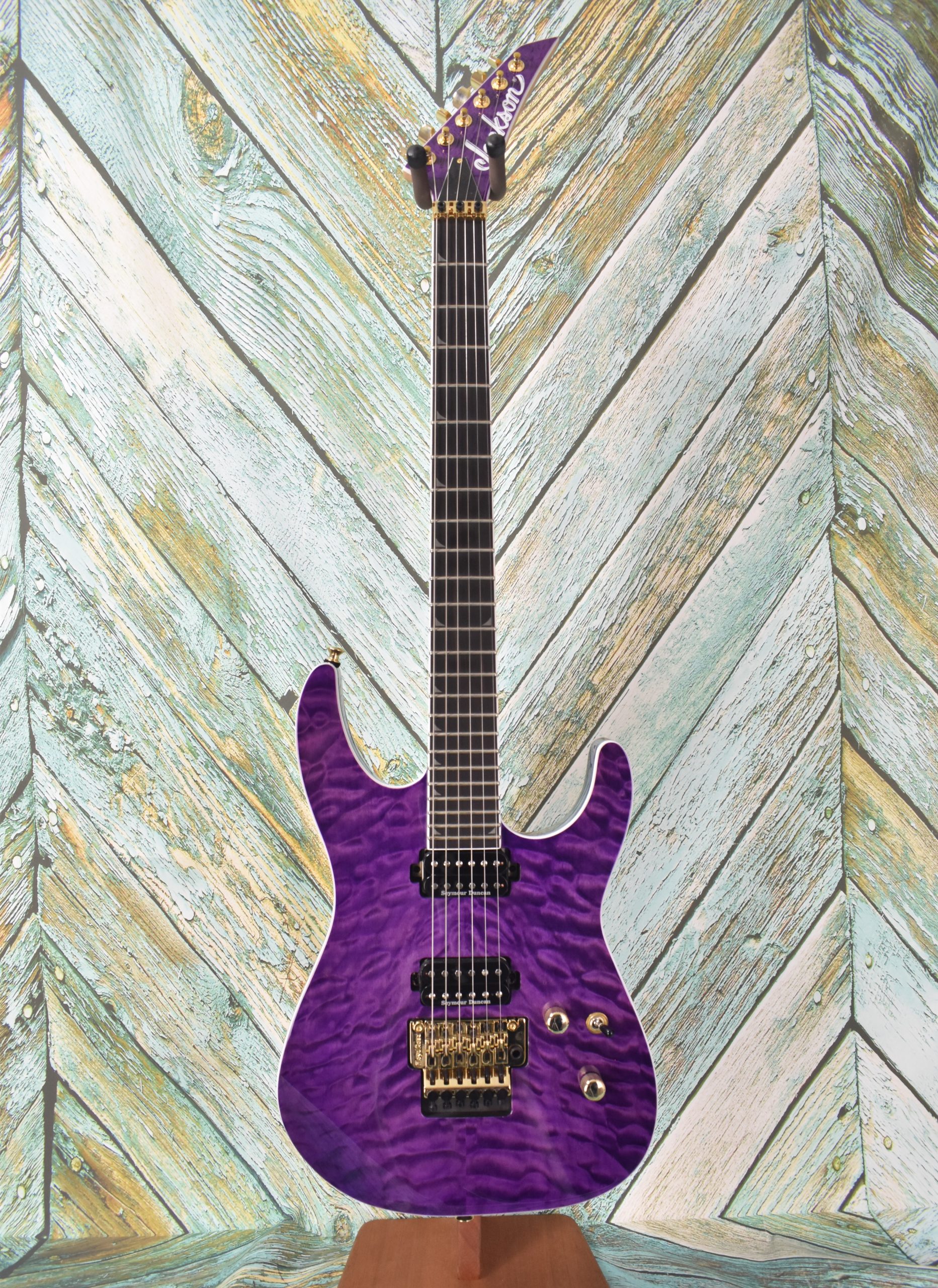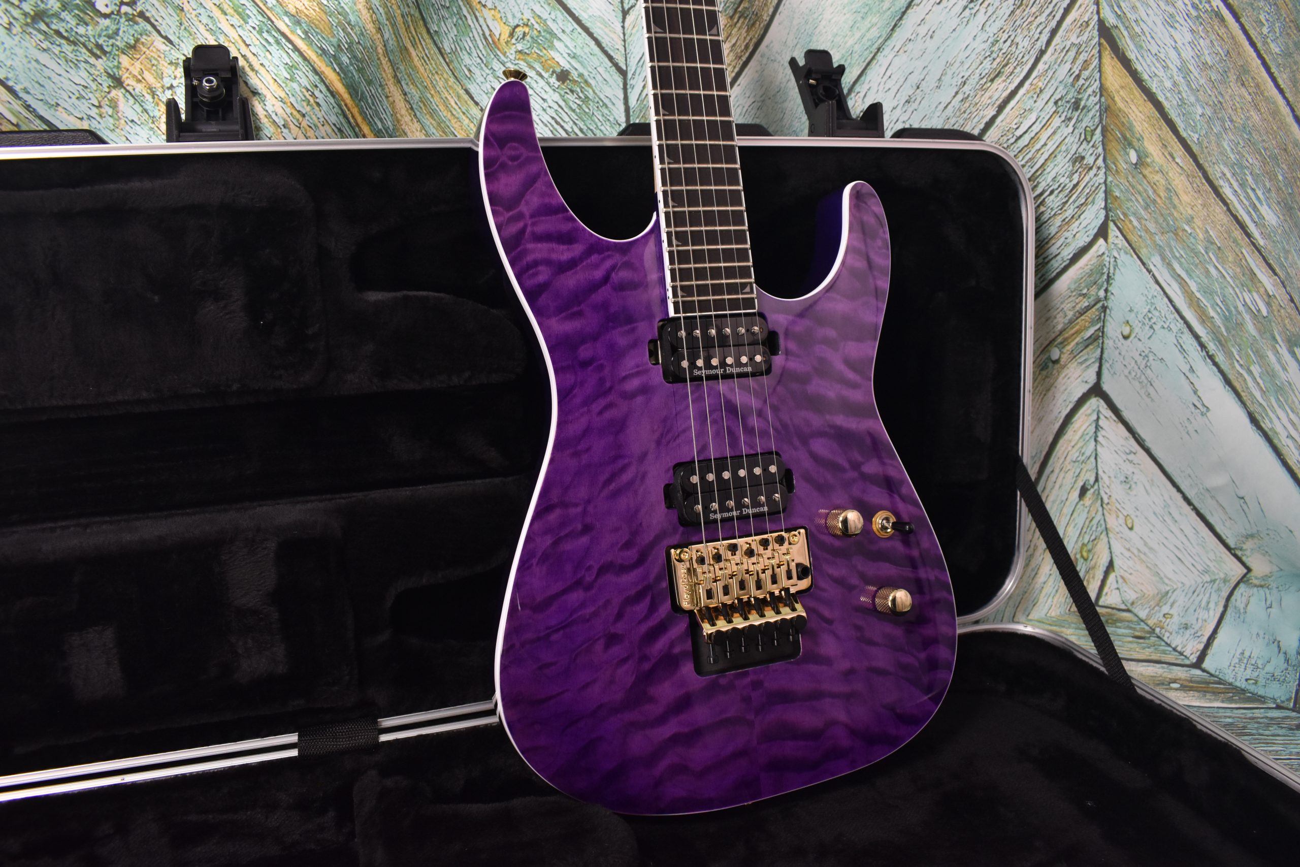 If you're looking for a superb playing guitar that's also eye catching this is your best bet! Made with a mahogany body and a beautiful quilt maple top. The neck through design to maximize sustain and Seymour Duncan pickups to give you that iconic high distortion Jackson voice. With the purple gloss and the gold hardware will make it impossible for people to keep their eyes off you on stage.
