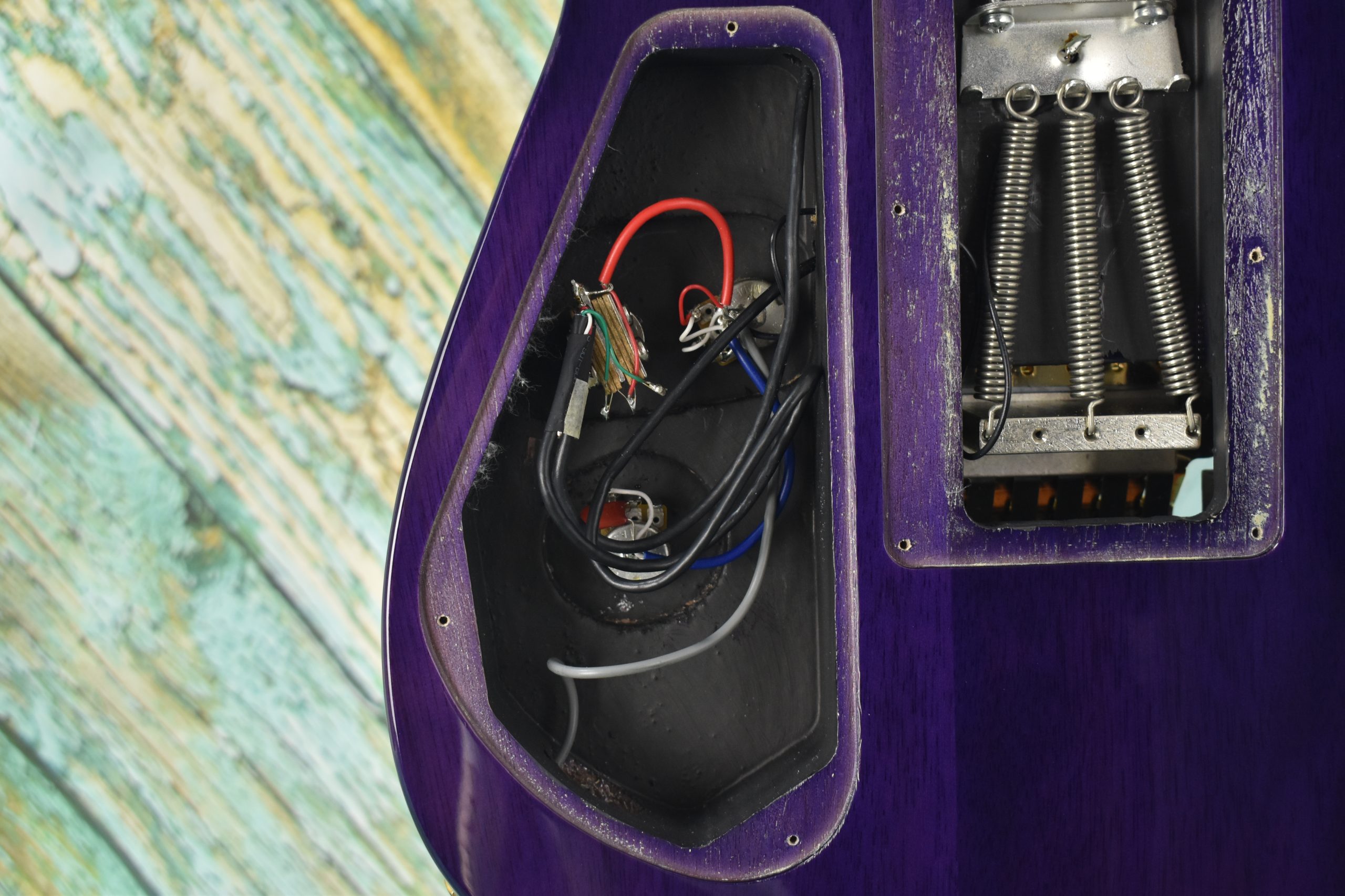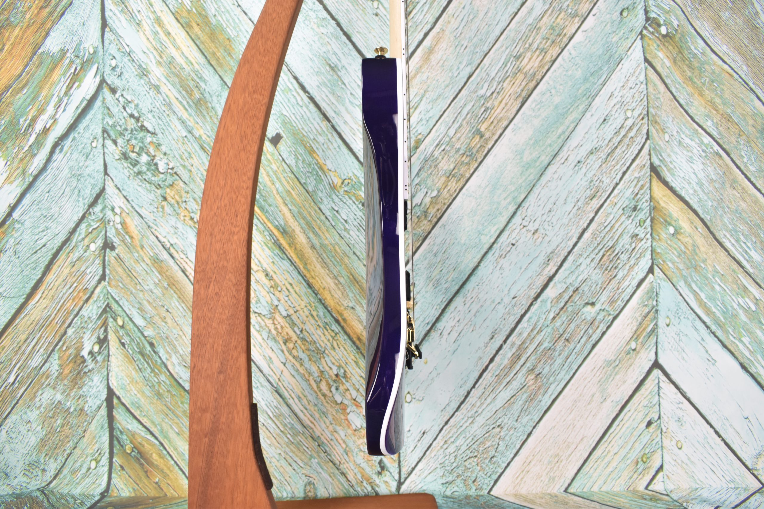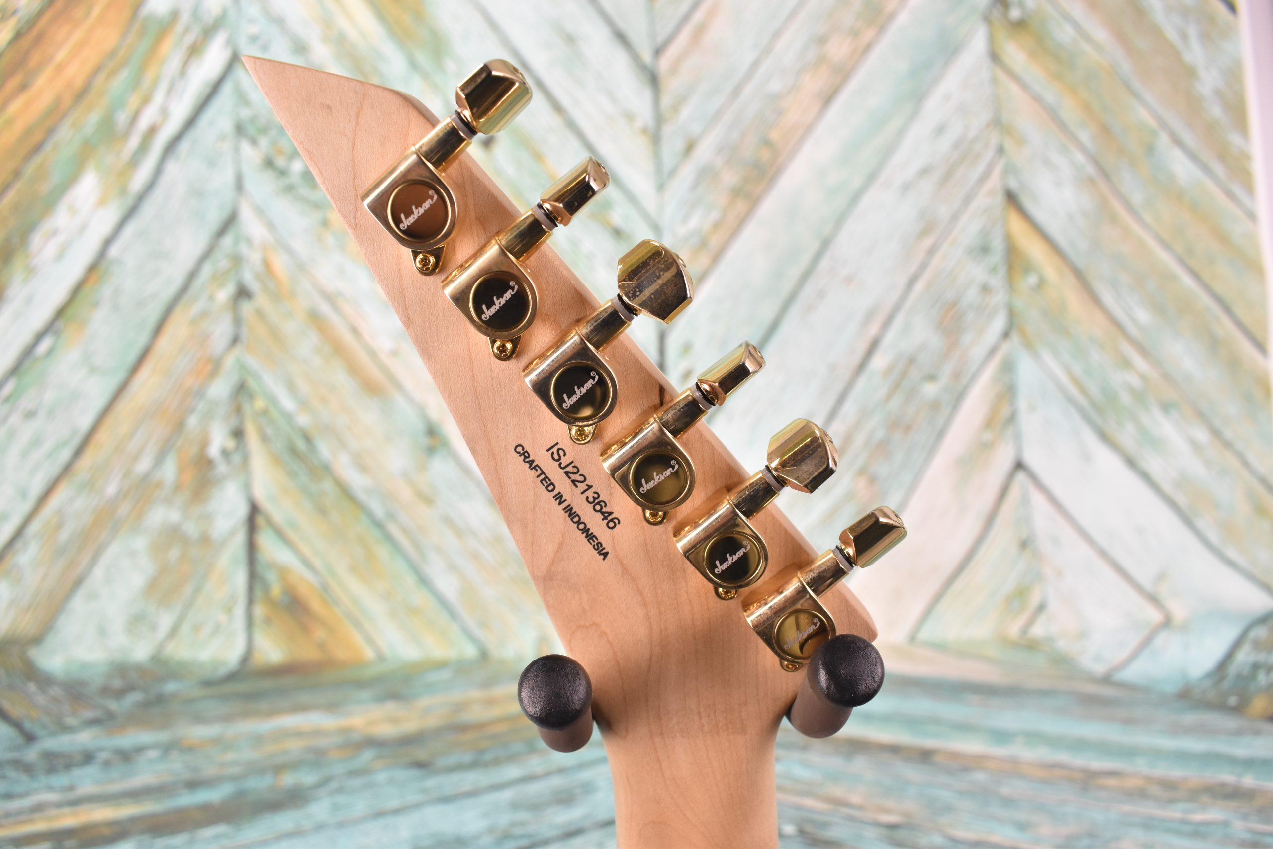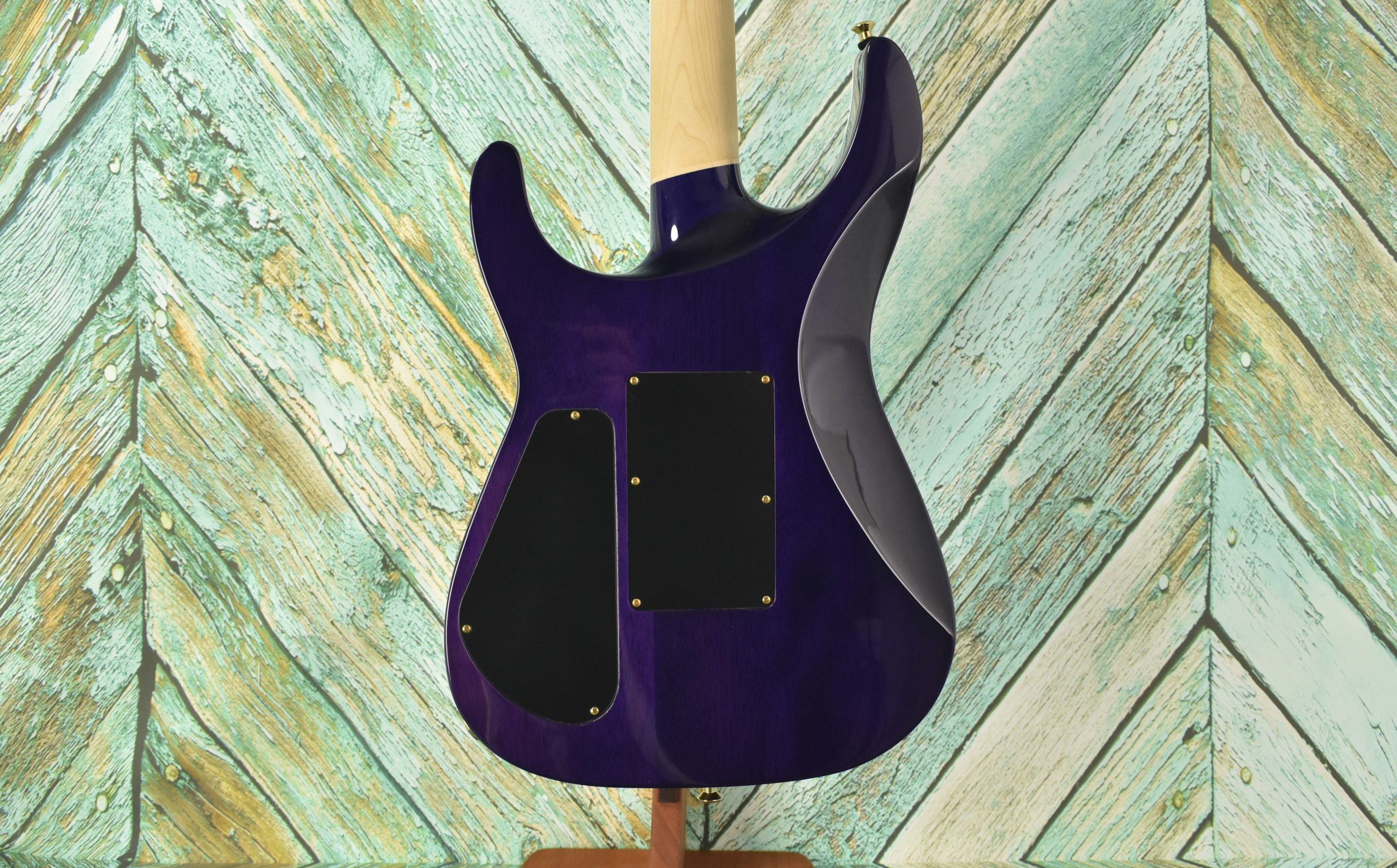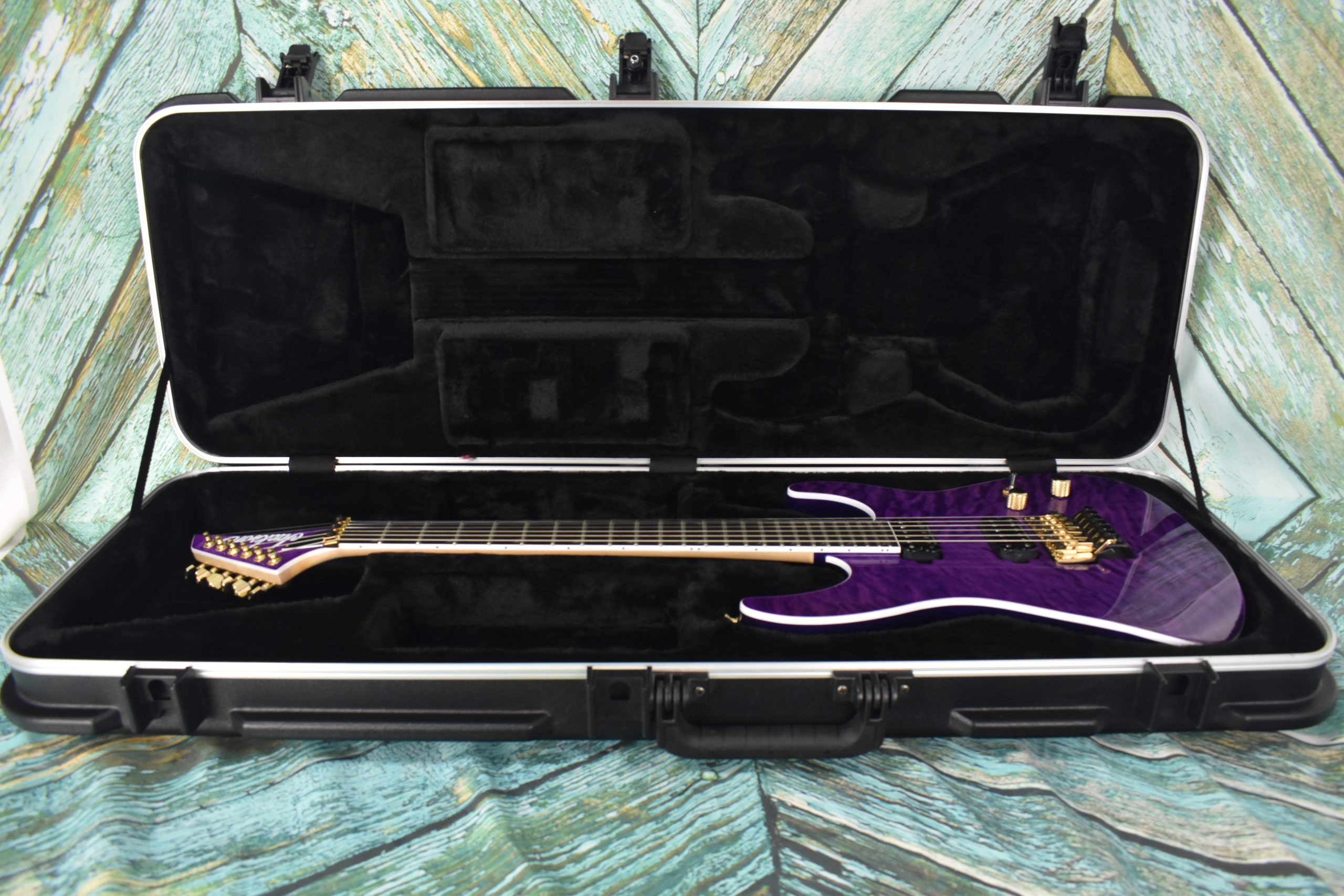 If you're looking for a superb playing guitar that's also eye catching this is your best bet! Made with a mahogany body and a beautiful quilt maple top. The neck through design to maximize sustain and Seymour Duncan pickups to give you that iconic high distortion Jackson voice. With the purple gloss and the gold hardware will make it impossible for people to keep their eyes off you on stage.